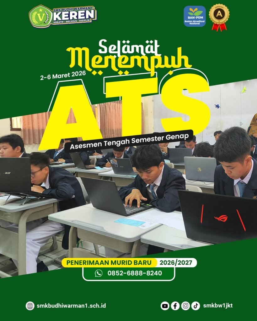 Asesmen Tengah Semester Genap SMK Budhi Warman 1 menjadi langkah penting dalam proses pembelajaran untuk mengukur pemahaman dan perkembangan kompetensi siswa. Dengan semangat disiplin, kejujuran, dan tanggung jawab, seluruh peserta didik diharapkan dapat mengikuti asesmen dengan optimal. Semoga hasil yang diraih menjadi motivasi untuk terus belajar dan berkembang menjadi generasi unggul dan siap menghadapi masa depan.